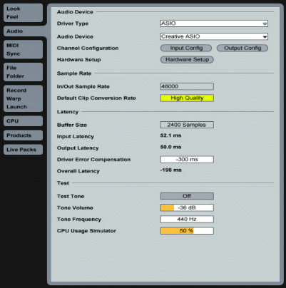 При первом запуске программа автоматически показывает окно Preferences, которое состоит из 7 вкладок: Look\Feel, Audio, MIDI\Sync, File\Folder, Recodr\Warp\Launch, CPU (рисунок 4).