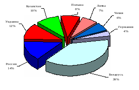 Часть продукции ООО "ИнавтомаркетТехно" экспортируется в страны СНГ и дальнего зарубежья. Структура реализации продукции предприятия представлена на Рис.6.