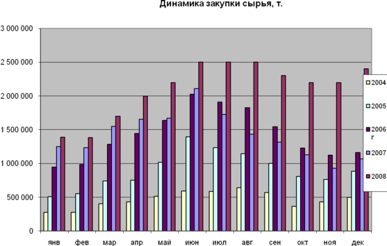 Объем закупки сырья увеличился в несколько раз (Рис.3). В начале 2005 года число поставщиков молока на предприятие, составляло более 70.