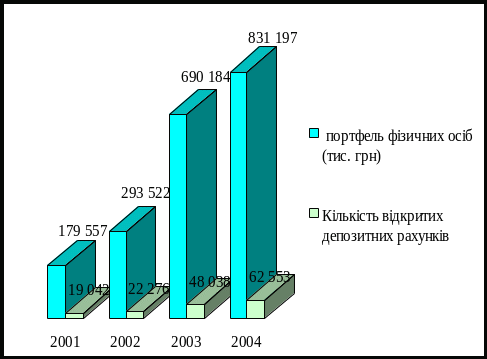 Обсяг кредитування фізичних осіб за 2004 рік збільшився, порівняно з 2003 р. у 1,33 рази або в абсолютних цифрах на 169 910 000 грн. та становив 692 140 000 грн. Цих об’ємів вдалося досягти завдяки впровадженню різноманітних програм для кредитування громадян, а саме: