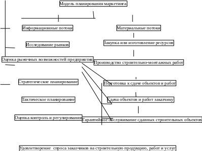 Рыночная ориентация строительного производства может быть представлена как совокупность мер и усилий руководства предприятия по управлению материальными и информационными потоками. Одной из главных задач в строительном производстве является ресурсосбережение - сбережение труда, сырья, материалов, капитала и т.д. Строительство - одна из самых материалоемких отраслей народного хозяйства. В некоторых случаях затраты на материальные ресурсы составляют 70% и более от сметной стоимости объекта. В связи с этим необходимо изучение материальных потоков при планировании маркетинга предприятия. В основе разработки модели планирования лежит производственный процесс возведения строительных объектов, выполнения строительно-монтажных работ.