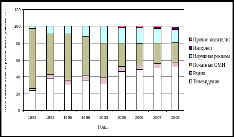 Как видно из таблицы 6 и рисунка 2, в 1992 наибольшую долю рекламных бюджетов страны занимали печатные СМИ – около 71%. Далее в целом наблюдается тенденция к снижению доли печатных СМИ: в 1995 г. – 55%; в 2000 г. – 41%; в 2005 – 27,3%; в 2008 г. – 23,4%.