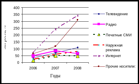 С 2000 по 2005 гг. наблюдался существенный рост затрат на рекламу на телевидении. Несмотря на цены телевизионной рекламы, в пересчете на самый главный показатель, который интересует всех рекламодателей, – стоимость тысячи контактов – телевидение остается самым дешевым носителем. Более или менее на одном и том же уровне остается радио. Снижение роста расходов на рекламу в газетах происходит за счет снижения доли мелких объявлений, газет бесплатных объявлений, резко снизилась доля рекламных изданий, так как рекламодатели постепенно переходят к более эффективным формам рекламы [19, стр. 87–94].