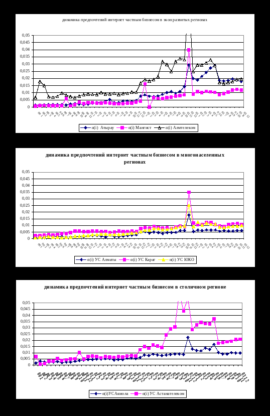 Выводы для динамик изменений объемов трафика для областей 3-х групп регионов совпадают с ниже приведенными выводами, полученными для значений субъективных предпочтений рассматриваемой категорий населения – частных предпринимателей и частных фирм в интернет-услугах. Диаграмма 1 это иллюстрируют.