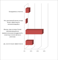 По вопросу является ли реклама, размещенная в художественном фильме/телешоу эффективнее рекламных роликов, мнение населения распределилось следующим образом: половина опрошенных, а именно 25 человек, считают, что реклама, размещенная в художественном фильме/телешоу лишь иногда эффективнее рекламных роликов, при условии более запоминающейся и профессионально внедренной в сюжетную линию фильма рекламы, среди них люди имеющие высшее профессиональное образование (10 человек). Равное число опрошенных уверены в том, что реклама, размещенная в художественном фильме/телешоу значительно эффективнее рекламных роликов (10 человек) и рекламный ролик всегда более эффектный и запоминающийся, чем реклама, размещенная в художественном фильме/телешоу. И лишь 5 человек затруднились с ответом на этот вопрос.