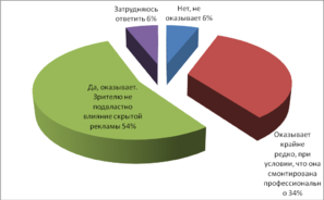 | 3 | Да, оказывает. Зрителю не подвластно влияние скрытой рекламы | 27 | 54% | ||
