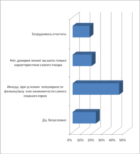 Большинство опрошенных, а именно 22 человека считают, что при рекламировании товара главным героем фильма/шоу товар вызывает больший интерес и доверие со стороны потребителей, при условии популярности фильма/шоу или знаменитости самого главного героя. 11 человек убеждены в том, что при рекламировании товара главным героем фильма/шоу товар безусловно вызывает больший интерес и доверие со стороны потребителей. Лишь 9 человек ответили, что доверие может вызвать только характеристики самого товара. 8 человек затруднились с ответом на данный вопрос.