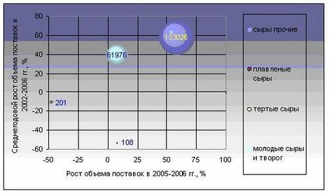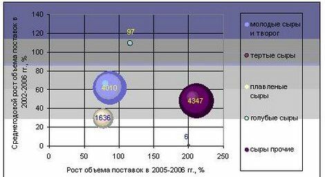 Импорт Республики Беларусь сыров и творога в 2002-2006 гг. характеризуется значительным увеличением темпов роста. Если в 2002-2006 гг. ввоз рассматриваемой продукции рос в среднем за год на 48% в стоимостном выражении (на 43% — в физическом выражении), то в 2005-2006 гг. — он увеличился на 124%.