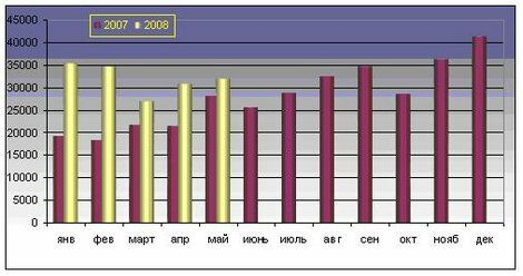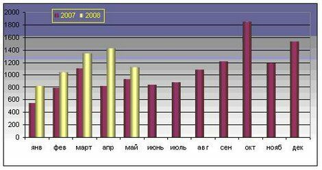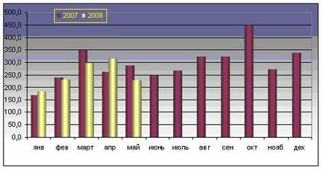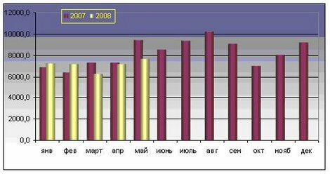 Белорусский экспорт сыров и творога в 2007 г. вырос относительно 2006 г. на 56,8% в стоимостном выражении и на 19,9% — в физическом. Динамика экспорта Республики Беларусь в январе 2007- мае 2008 г. сыров и творога, в тоннах и в долл. представлена на рисунке 1.3 и на рисунке 1.4.