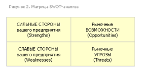 В целом, проведение SWOT-анализа сводится к заполнению матрицы, изображенной на рис. 2, так называемой «матрицы SWOT-анализа». В соответствующие ячейки матрицы необходимо занести сильные и слабые стороны предприятия, а также рыночные возможности и угрозы.