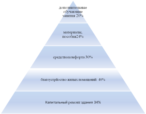Для удобства анализа материальные потребности интернатов были разбиты в соответствии с потребностями по пирамиде Маслоу. Большая часть респондентов (34% и 40%) высказались за то, чтобы направлять пожертвования на капитальный ремонт здания интерната либо благоустройство жилых помещений, которые можно отнести к базовым потребностям – потребности в безопасности и тепле. Удовлетворение первичных потребностей входит в компетенцию государственных органов. Следовательно, в восприятии аудитории наблюдается смешение роли благотворительных фондов и государства. Также, можно отметить, что общественность не готова задумываться над вопросом повышения уровня образования и культуры детей, оставшихся без попечения, поскольку только 20% опрошенных отметили необходимость проведения дополнительны занятий (потребность в самоактуализации) и 24% за закупку качественных обучающих пособий. Учитывая небольшое количество респондентов (300 человек), отклонение в 10% – достаточно существенный показатель. Отсутствие эмпатии по отношению к интернатовцам вызвано, вероятно, неконкретным, обобщённым образом детей, оставшихся без попечительства. Поэтому при слове «интернат» обычно рождается ассоциативное восприятие учреждения, здания, хозяйственной постройки, через которые проходит поток дошкольников и школьников.