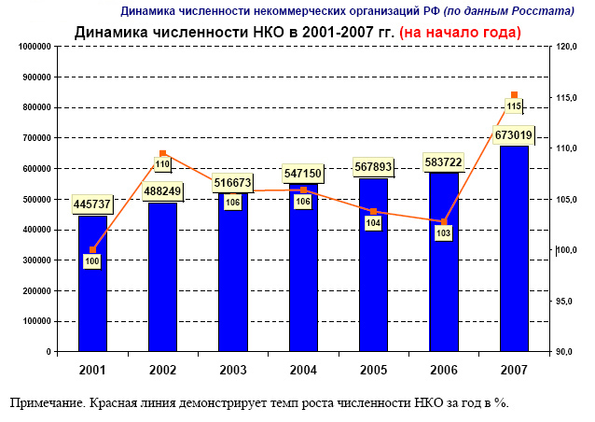 С этого момента начинается бурный рост фондов и некоммерческих объединений (см. диаграмма 1). На 1 октября 2006 г. в стране было зарегистрировано 665 623 некоммерческие организации, из которых 306 603 представляли собой учреждения, включая органы государственной и муниципальной власти. Остальные 359 020 единиц – это структуры гражданского общества, оформленные в качестве зарегистрированных организаций. Их число быстро увеличивается. С начала 2001 г. оно возросло на 34%. (Доклад общественной палаты Российской Федерации «О состоянии гражданского общества в Российской Федерации»)