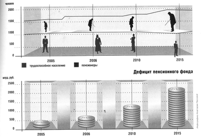 Также, в виду стабильного падения рождаемости и особенно глубокого его упадка в 90-е, годы российские демографы бьют тревогу. Во-первых, из-за отсутствия смены поколений, наблюдается спад количества трудоспособного населения, и очевидно последует дефицит пенсионного фонда (См. диаграмму 2). Во-вторых, спад рождаемости в период 1990-1997 гг. привёл к тому, что на настоящий момент недостаточно девушек детородного возраста, и это в будущем усугубляет тяжелое положение российской экономики.