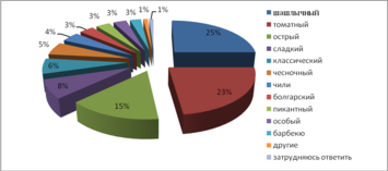 Сегодня на рынке представлен значительный ассортимент кетчупов. В России больше всего популярен шашлычный кетчуп. Он пользуется спросом почти у 48% опрошенных респондентов (см.рис.2.1). Это, скорее всего, обусловлено тем, что баланс специй в нем наиболее близок к болгарскому кетчупу.