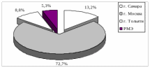 Проанализировав эти диаграммы можно сказать, что основными потребителями продукции ООО «Элдис» являются организации, находящиеся за пределами Республики Марий Эл, в наибольшей степени продукция фирмы ориентирована на рынок г. Москва.
