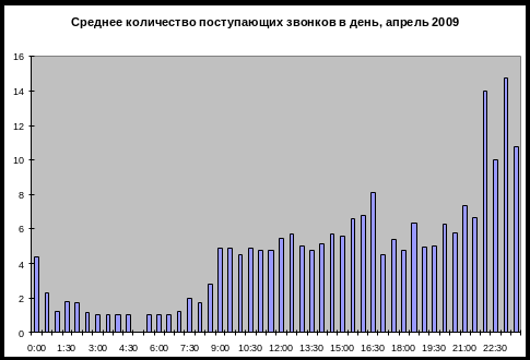 Данный график отображает среднюю нагрузку в день по входящим звонкам на техническую поддержку в апреле месяце 2009 года в компании Ланк Телеком.