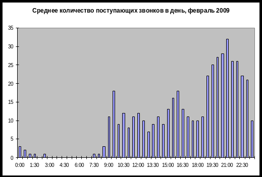 Данный график отображает среднюю нагрузку в день по входящим звонкам на техническую поддержку в феврале 2009 года в компании Ланк Телеком. На графике четко наблюдается "вечерний наплыв" клиентов. Максимальная нагрузка приходится на период от 21-00 до 21-30, в среднем в феврале месяце в данный промежуток времени поступило 35 входящих обращений по телефону от клиентов.