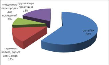 Таким образом, в структуре реализуемых видов продукции преобладают продажи пластиковых окон (60%), гаражных ворот, рольставней, дверей (14%), модульных перегородок для помещений (8%).