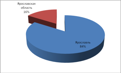 Из рисунка видно, что основной объем продаж приходится на город Ярославль (84%). На территории ярославской области (кроме города Ярославль) реализуется 16% товаров.