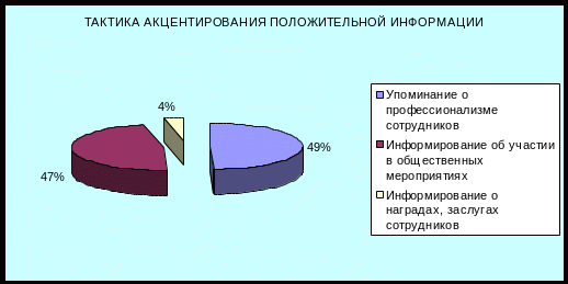 Тактика акцентирования положительной информации выражается через использование слов положительной оценки. Данная тактика должна показать аудитории основные положительные качества организации и её сотрудников, их успехи и (самое главное) достижения, принесшие пользу общественности.