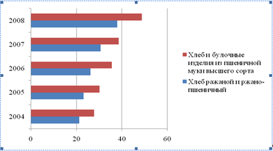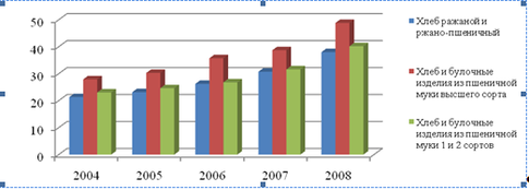 Из приведенного рисунка мы видим, что цены на перечисленные товары изменялись незначительно, не считая данных за 2008 год. Это связано прежде всего с государственным регулированием цен на хлеб и хлебобулочные изделия, так как это является товарами первой необходимости и выполняется посредствам распоряжения Правительства РФ.