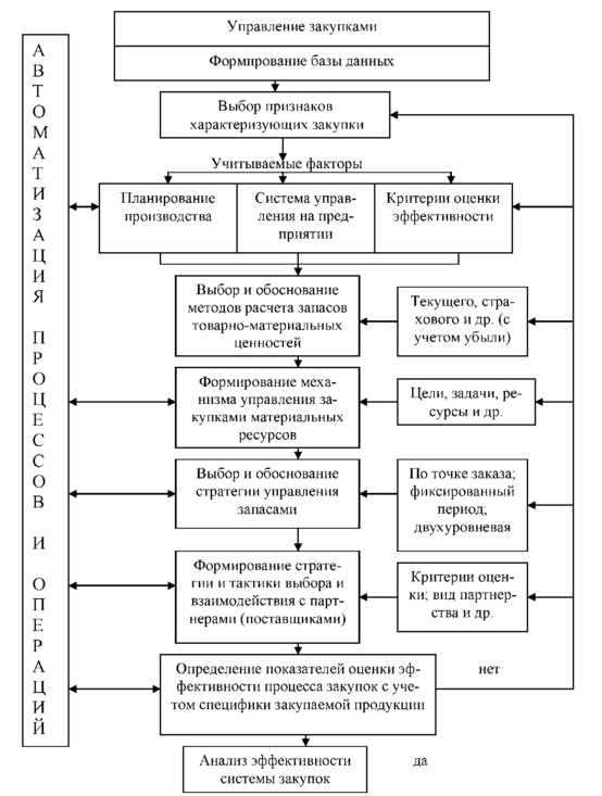 В широком смысле закупочная деятельность включает также точную оценку потребности в материалах и услугах; поиск и отбор соответствующих поставщиков; согласование с поставщиками таких вопросов, как, например, цены и сроки поставок; обсуждение условий контрактов и заказов; ясное понимание того, будет ли фирма-поставщик надежным партнером в течение всего срока действия договора [18, c. 110].