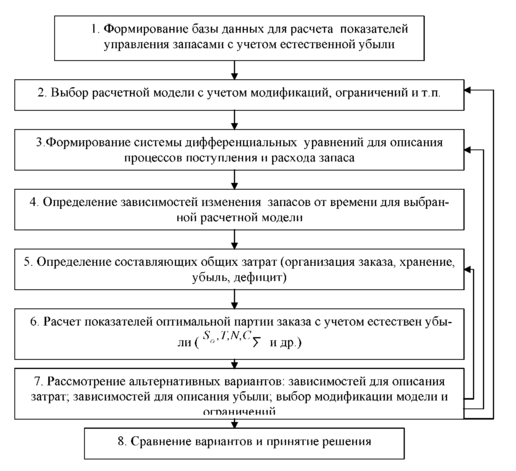 Блок 3. После выбора модификации модели EOQ определяются зависимости для описания процессов поступления продукции, расхода запаса, дефицита, а также убыли. Естественная убыль может подчиняться не только линейной или экспоненциальной зависимости, но и иметь дискретный характер.