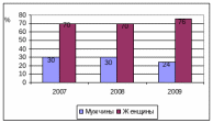 В структуре персонала по полу наблюдаем преобладание женщин: 76 % женщин в 2009г. против 24 % мужчин (рис. 2.5).