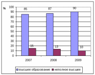 Положительным моментом является увеличение доли сотрудников компании с высшим образованием – с 85 % в 2007г. до 90 % в 2009г., что свидетельствует о высокой квалификации кадров. Остальные сотрудники компании имеют неполное высшее образование (рис. 2.6).