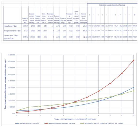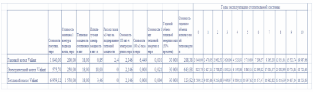 Таблица 3.2 Исходные данные сравнительного расчета затрат на покупку и эксплуатацию систем отопления дома площадью 100 м2 с помощью газового котла, электрического котла и теплового насоса по кредитной схеме на 10 лет (тепловая мощность 18 квт) фирмы Valiant (Германия)