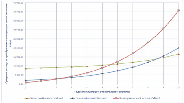 Рис.3.2. Динамика затрат на покупку и експлуатацию систем отопления дома площадью 100 м2 с помощью газового котла, электри-ческого котла и теплового насоса(тепловая мощность 18 квт) фирмы Valiant (Германия) при кредитной схеме приобретения теплового насоса (10 лет)
