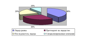 Как видно из рисунка, около 40% рынка находится в руках у лидера рынка - компании, занимающей самую крупную долю рынка. Еще 30% рынка сосредоточены в руках компании - претендента на лидерство, занимающей среди конкурентов второе место и ведущей нелегкую борьбу за увеличение своей доли рынка. Еще 20% рынка находится в руках последователя лидера, также входящего в группу ведущих компаний, которая стремится удержать свою долю, не раскачивая при этом «лодку» отрасли. Оставшиеся 10% рынка принадлежат компании, специализирующейся на обслуживании узких сегментов рынка - рыночных ниш, на которые не претендуют другие компании-конкуренты.