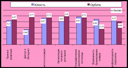 Проведенный анализ показал, что расхождение в оценке потребительской удовлетворенности расхождение не значительное, всего на 0,12 бала. Средняя оценка качества потребителями в гостинице "Орбита" выше, чем в гостинице "Юность", за исключением графического положения и возможности бронирования номера.