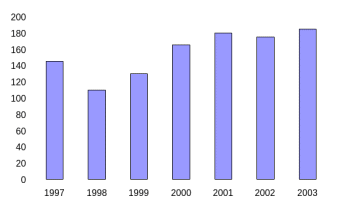 Рынок магазинов бытовой техники характеризуется высоким уровнем конкуренции. Сегодня рынок бытовой техники является одним из динамично развивающихся рынков. Так по данным исследовательской фирмы «Гортис» в 2003 году уровень розничных продаж составил 175-195 тыс.долл., что значительно выше уровня 2002 года (рис. 2.1.).