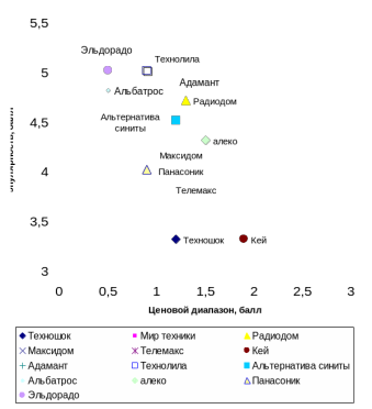 Оценка популярности проводилась по 5-ти балльной системе, а оценка ценового диапазона по 3х балльной шкале (от 0 до 1 –цены ниже средних, от 1 до 2 – цены соответствуют средним ценам на рынке и от 2 до 3 цены выше средних).