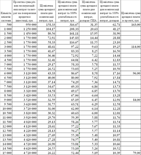 Таблиця Е.1 Абонементна плата за користування системою Інтернет-реклами при річному доході, який за перші 2 роки компенсує експлуатаційні витрати та витрати на проценти, а з 3 року компенсує повернення кредитних інвестицій