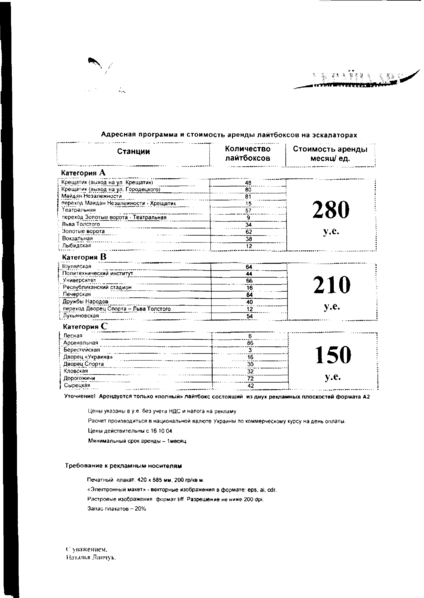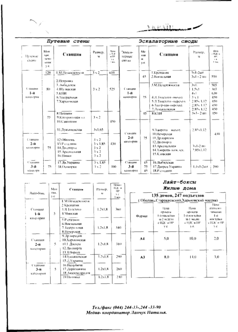 Види рекламних послуг ТОВ “Україна – АРТ” в метрополітені та їх вартість
