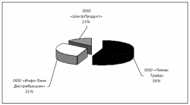 Далее, рассмотрим структуру поступления макаронных изделий в магазин №12 ООО «Лимак-Трейд» в 2007 г. (таблица 7). По сумме заключенных договоров первенство принадлежит компании ООО «Лимак-Трейд», ей принадлежит доля в 55,23% (58,35 тыс. рублей) от общего объема заключенных договоров. На втором месте – ООО «Инфо-Линк Дистрибъюшен», у него доля – 31,43% (на сумму 33,20 тыс. рублей).