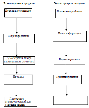 Процесс продажи – это набор действий, предпринимаемых продавцом для подготовки покупателя к принятию решения о приобретении товара. Этапы процессов покупки и продажи тесно взаимосвязаны (см. рис. 1.2.).