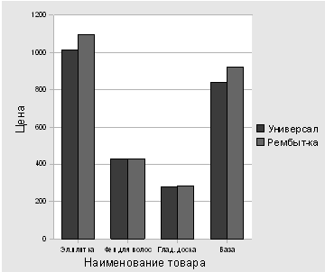 Рис. 2.4. Сравнительный анализ цен товаров в "Универсале" и "Рембыттехнике"