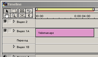 2. Перетягніть, натискаючи й утримуючи ліву кнопку миші на піктограмі кліпу, кліп Veloman.eps у вікно Timeline (Тимчасова шкала) у початок треку Video 1А (Відео 1А) (рис. 2.7).