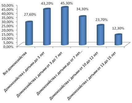 Рисунок 2.2 - Доля покупателей игрушек среди домохозяйств с различным числом детей (%) (Источник: КОМКОН-Медиа)