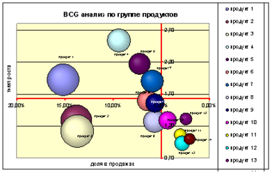 Точка раздела товаров по темпам роста можно определить как средний темп роста всех продуктов компании за оцениваемый период. Точка раздела товаров по величине доли в объеме продаж определяется путем экспертной оценки, после нанесения на матрицу всех товаров компании.
