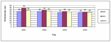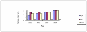 Рассматривая изменение продолжительности работы сотрудников, автором выявлен тот факт, что, несмотря на незначительное увеличение (2001 год – стаж составлял 2 года, 2004 год – 3 года), средняя продолжительность работы в маркетинговой службе растет, что является положительным моментом. Причем, у мужчин стаж работы в маркетинговом подразделении вырос с 1,5 года до 3 лет, а у женщин с 2,5 до 3 лет. Различный темп роста обусловлен меняющимся соотношением мужчин и женщин.