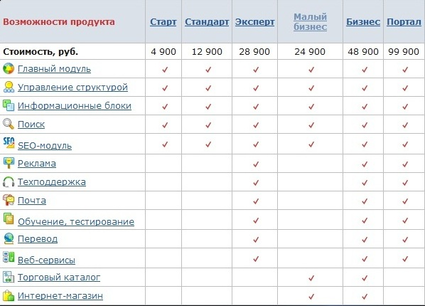 Вторая функция – сравнение однородных продуктов по параметрам (например, таблица сравнения программного продукта 1С-Битрикс). Очень удобно при выборе нужного продукта, а значит, помогает потенциальному клиенту стать реальным.(Табл 2.1)
