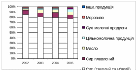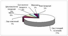 Основною продукцiєю пiдприємства є продукцiя, вироблена з молочної сировини: твердi сири, плавленi сири, масло вершкове, морозиво, сухi молочнi продукти та рiзноманiтний асортимент продукцiї з незбираного молока (рис. 2.1, 2.2).
