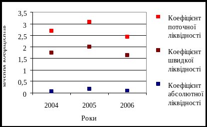 Ми розглянули три коефіцієнти: коефіцієнт поточної ліквідності, коефіцієнт швидкої ліквідності, коефіцієнт абсолютної ліквідності, які характеризують достатність поточних активів для погашення поточних зобов'язань підприємства [1].