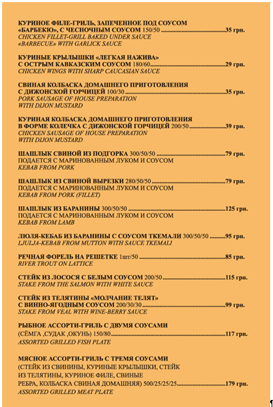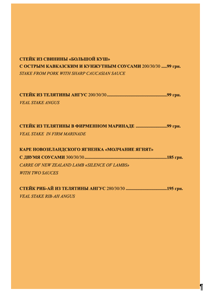 Окремим недоліком ресторану можна вважати не правильне оформлення меню, у ньому усі страви переплутані між собою. Необхідно зробити правильну черговість страв. Також необхідно зробити окрему колонку для фірмових страв, це одразу б вплинуло на збільшення продажу фірмових страв. Споживач, який вперше завітав до ресторану обов’язково скуштував би фірмову страву, а так він може просто не помітити її серед інших страв.