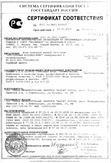 Безопасность, безвредность и физиологическая полноценность расфасованной питьевой воды должны быть подтверждены сертификатом соответствия, без которого производство и продажа её запрещаются.