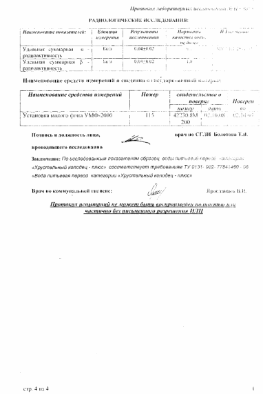 Радиационная безопасность воды оценивается по суммарной альфа - и бета-активности. При превышении нормативов общей активности питьевой воды необходимо определить радионуклиды и измерить их индивидуальные уровни радиоактивности. Радиационно-гигиеническая оценка обнаруженных концентраций проводится в соответствии с ГН 2.6.1.054-99 "Нормы радиационной безопасности" (НРБ-99).